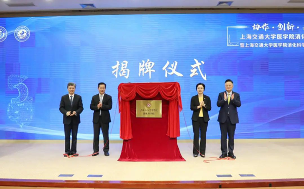 现场,上海交通大学医学院党委书记江帆,中国工程院院士、上海交通大学医学院院长范先群,附属仁济医院党委书记郑军华、院长夏强共同为上海交通大学医学院消化科学院成立揭牌。