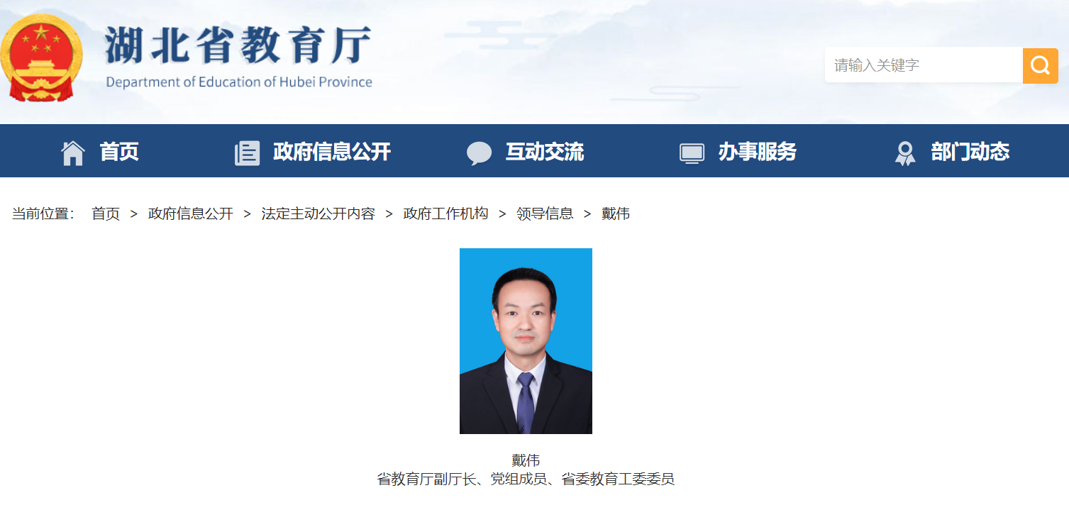 湖北省教育厅官方网站领导信息更新显示,戴伟现任省教育厅副厅长、党组成员、省委教育工委委员,分工负责高等教育处、科学技术处,省教育信息化发展中心(省电化教育馆)、省教育技术装备处,湖北幼儿师范高等专科学校。