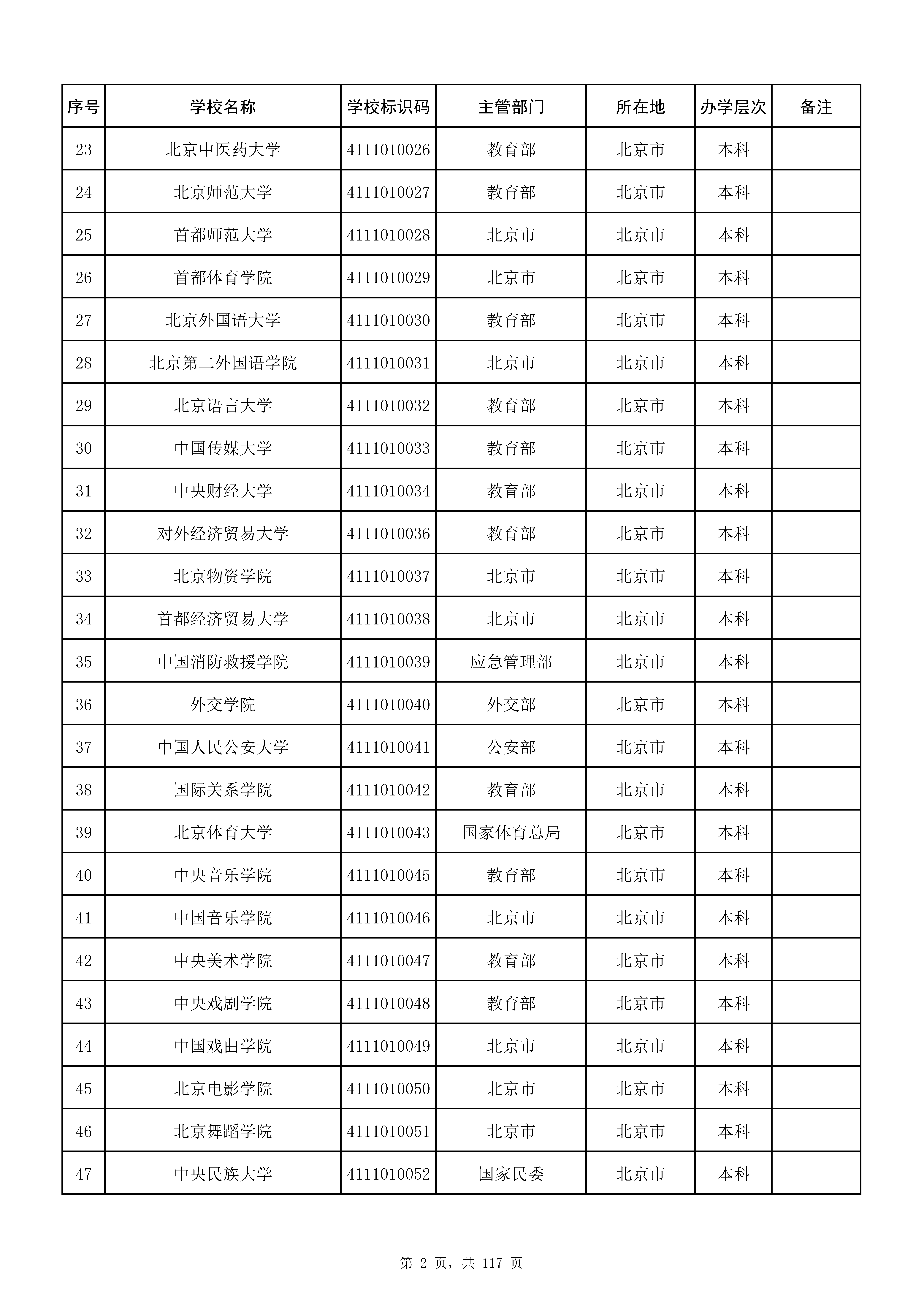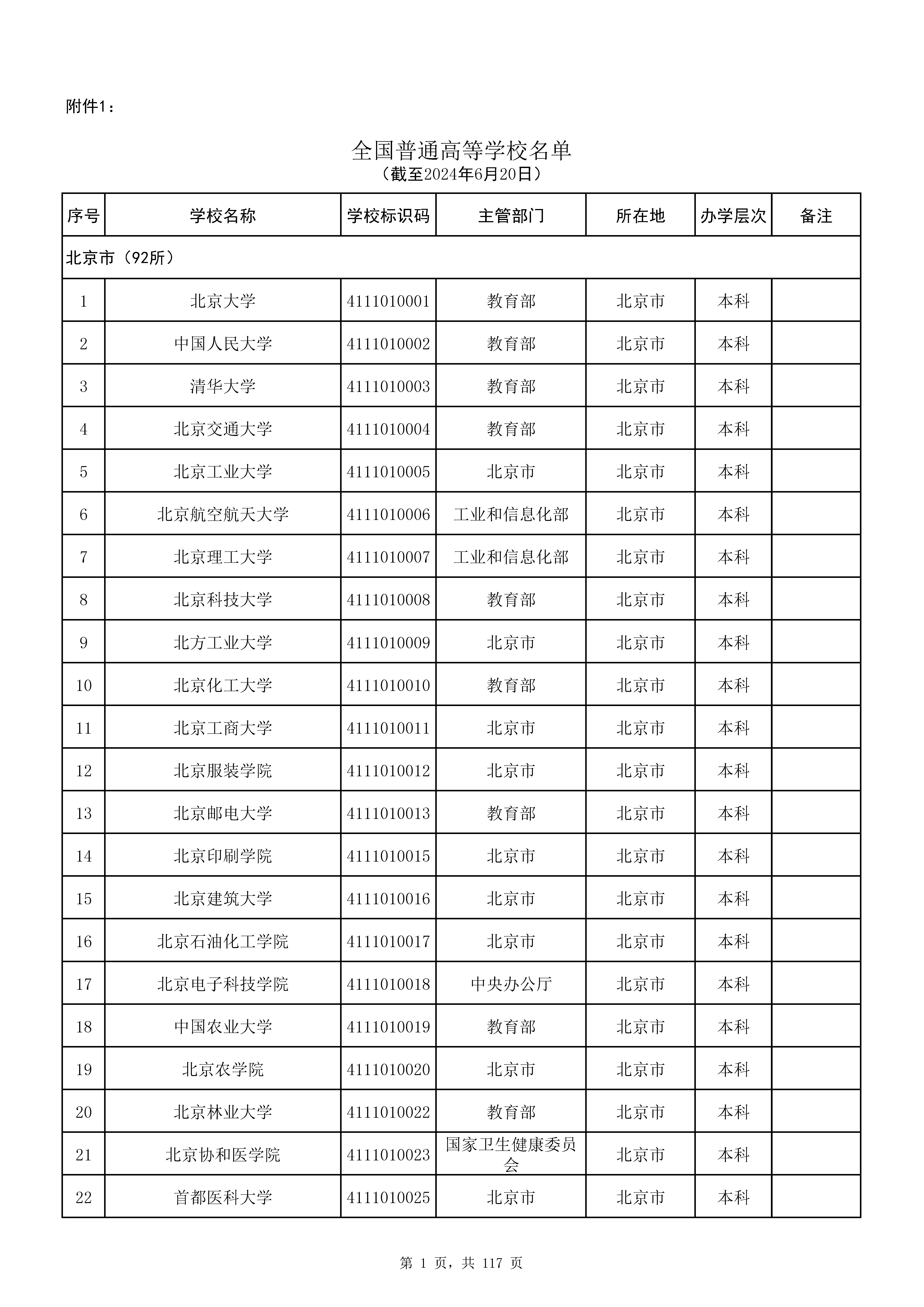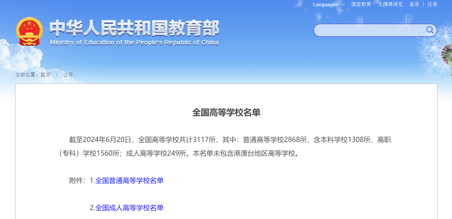 截至2024年6月20日,全国高等学校共计3117所,其中:普通高等学校2868所,含本科学校1308所、高职(专科)学校1560所;成人高等学校249所。本名单未包含港澳台地区高等学校。