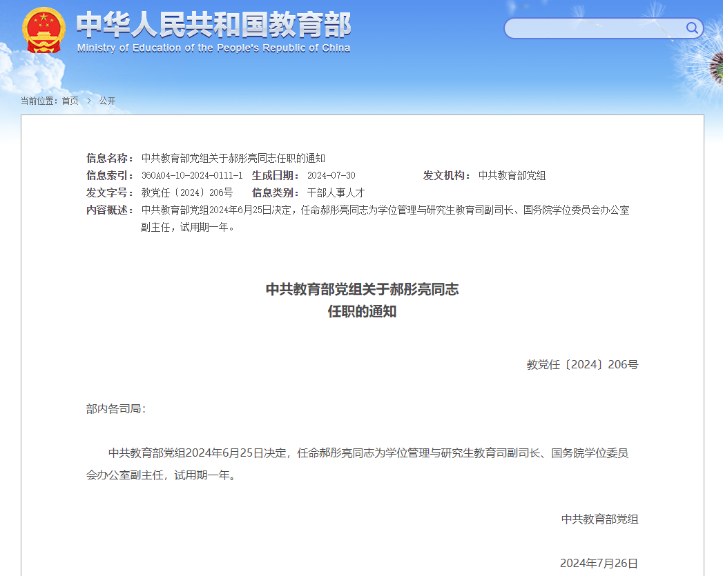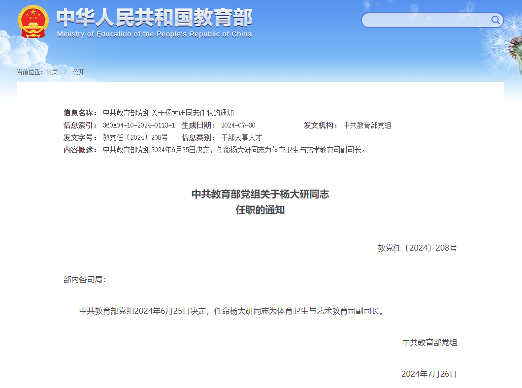 8月5日,教育部官网发布中共教育部党组关于杨大研同志、郝彤亮同志任职的通知。