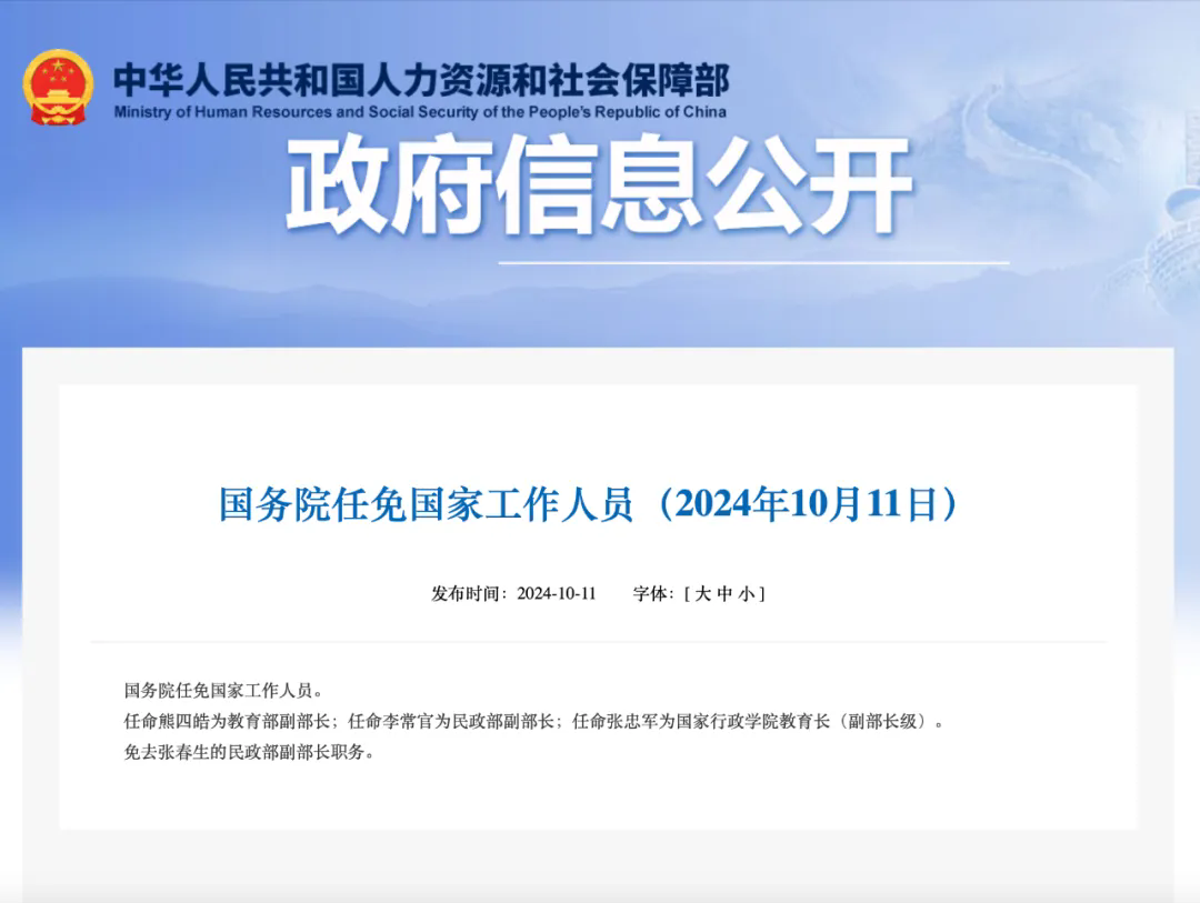 据人力资源和社会保障部网站10月11日消息,国务院任免国家工作人员: