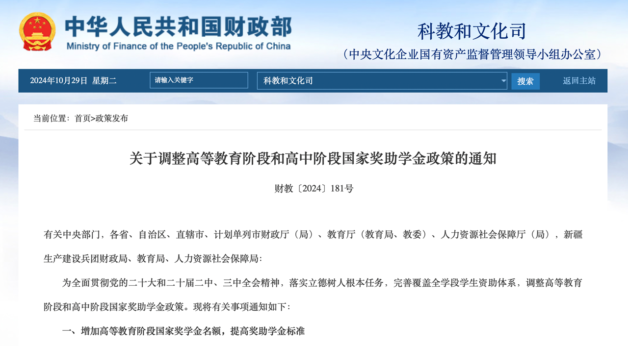 为全面贯彻党的二十大和二十届二中、三中全会精神,落实立德树人根本任务,完善覆盖全学段学生资助体系,调整高等教育阶段和高中阶段国家奖助学金政策。现将有关事项通知如下: