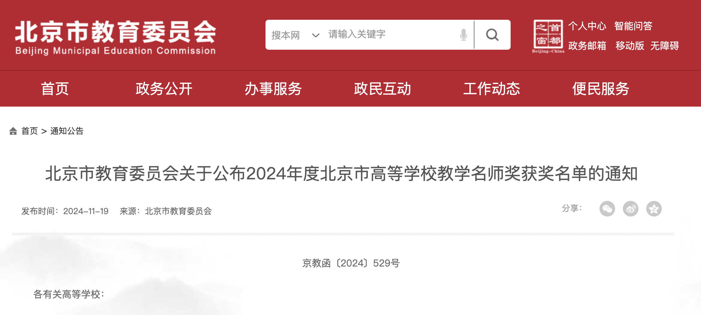 北京市教育委员会关于公布2024年度北京市高等学校教学名师奖获奖名单的通知