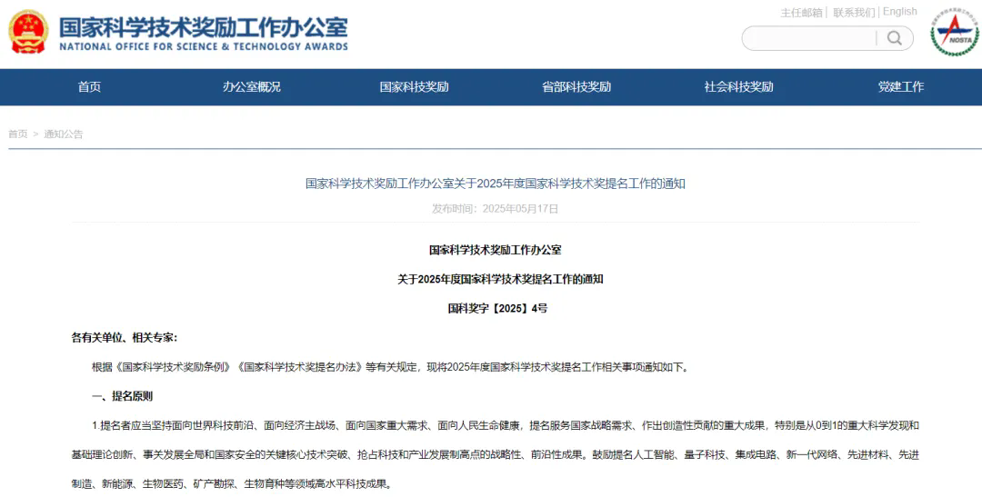 5月17日,国家科学技术奖励工作办公室发布《关于2025年度国家科学技术奖提名工作的通知》。