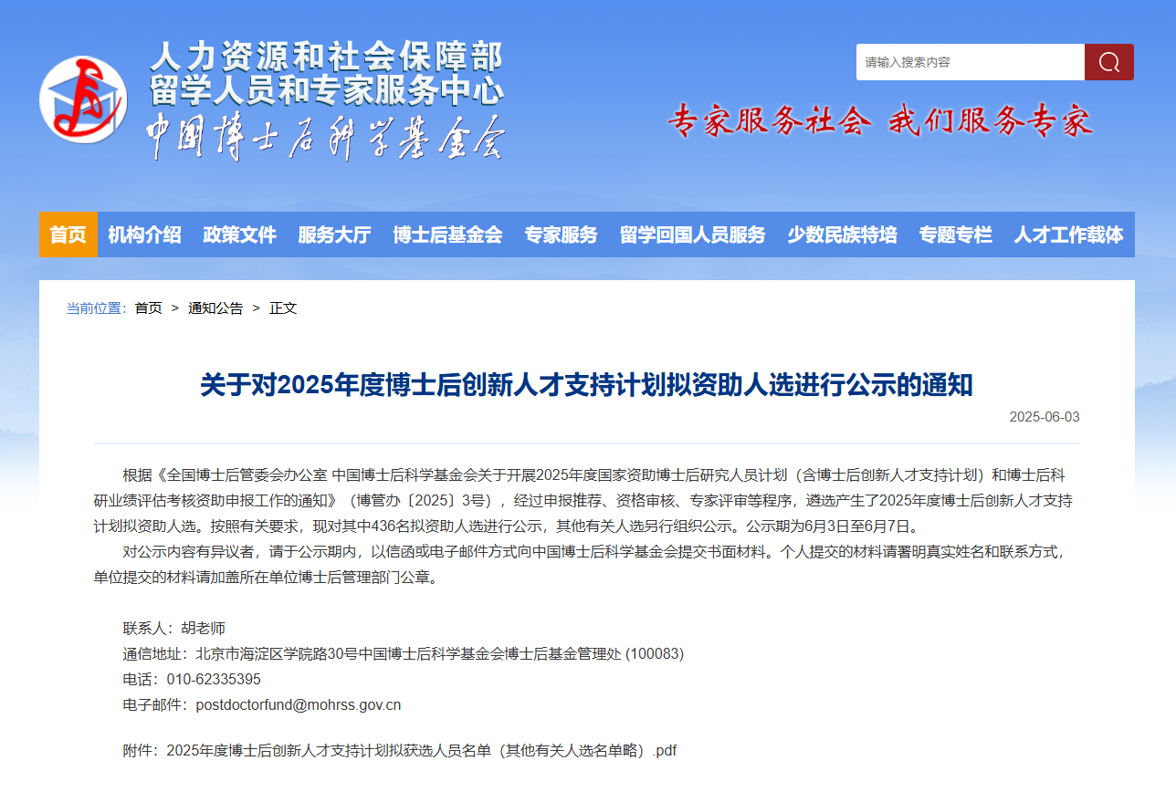 通知显示,根据《全国博士后管委会办公室 中国博士后科学基金会关于开展2025年度国家资助博士后研究人员计划(含博士后创新人才支持计划)和博士后科研业绩评估考核资助申报工作的通知》(博管办〔2025〕3号),经过申报推荐、资格审核、专家评审等程序,遴选产生了2025年度博士后创新人才支持计划拟资助人选。按照有关要求,现对其中436名拟资助人选进行公示,其他有关人选另行组织公示。公示期为6月3日至6月7日。