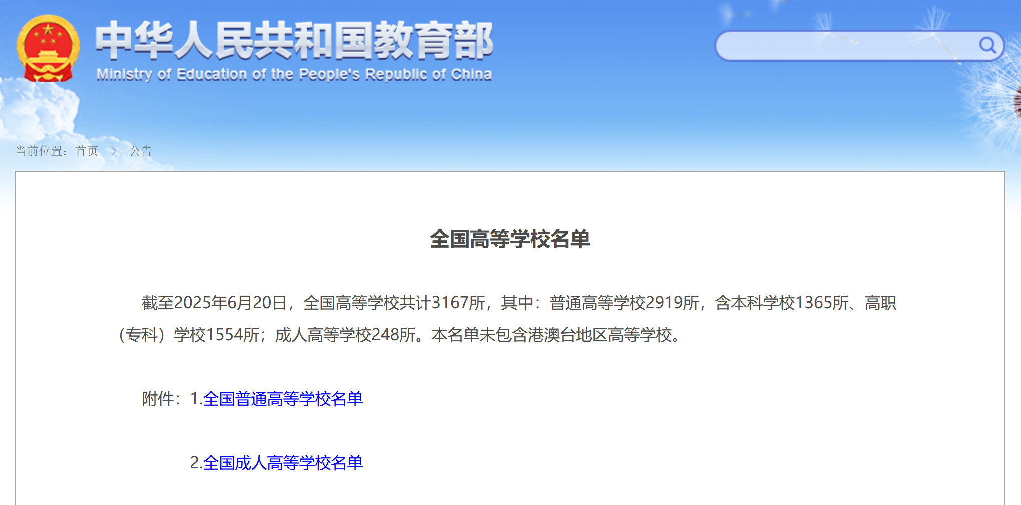 6月27日,教育部发布《全国高等学校名单》。