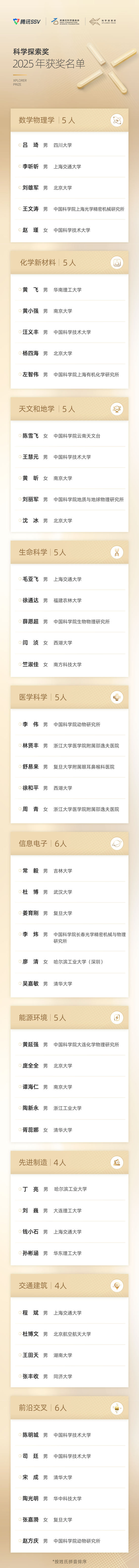 设立于2018年的“科学探索奖”是一项由新基石科学基金会出资、科学家主导的公益奖项,也是当前国内金额最高的青年科技人才资助项目之一。该奖项旨在支持在中国内地及港澳地区全职工作、45周岁及以下(2024年起女性放宽至48周岁)的优秀青年科技工作者,鼓励他们心无旁骛地探索科学“无人区”。