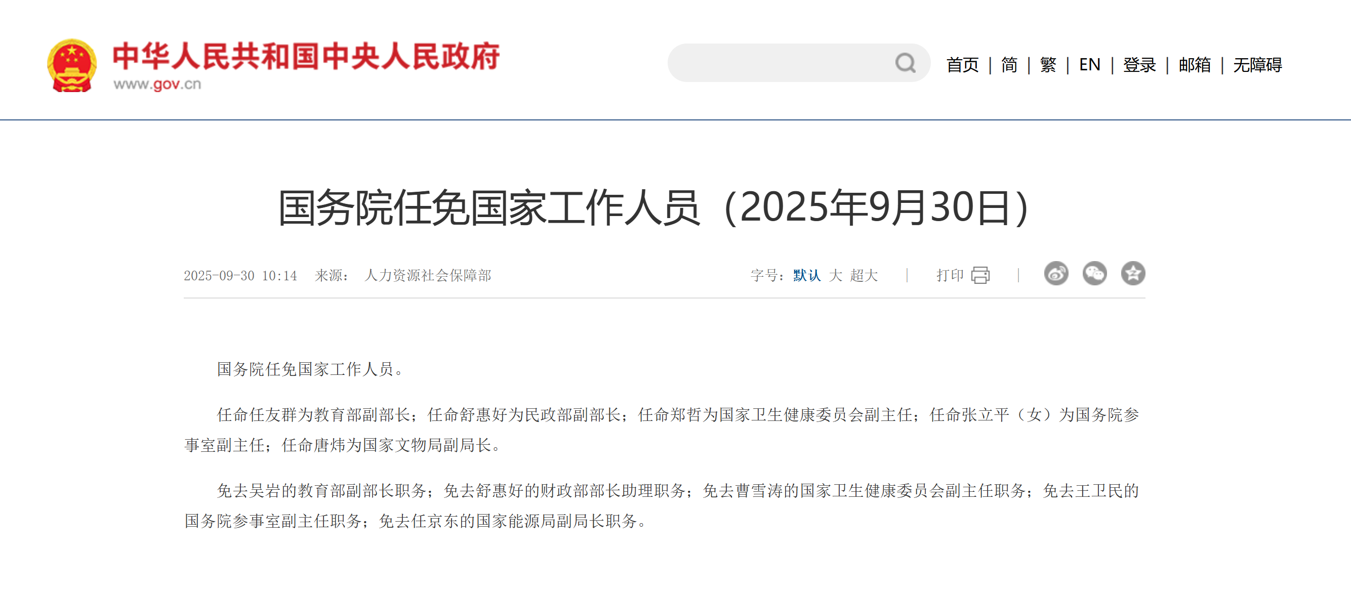 据人社部网站9月30日消息,国务院任免国家工作人员。