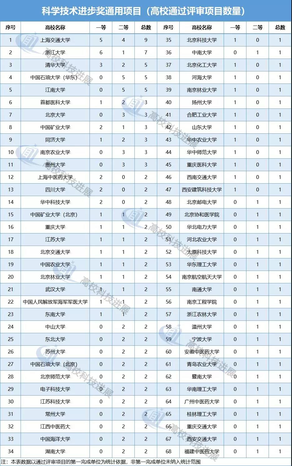 从科学技术进步奖通用项目的会议评审结果来看,共有68所高校推荐项目通过评审,获通过项目的高校数量与自然科学奖相差无几。