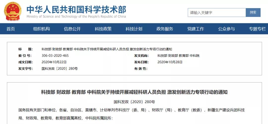10月28日,科技部网站发布了2020年科技部第280号文件(国科发政〔2020〕280号),决定继续组织开展“减轻科研人员负担、激发创新活力专项行动”。本次专项行动,也被人们称为“减负行动2.0”。