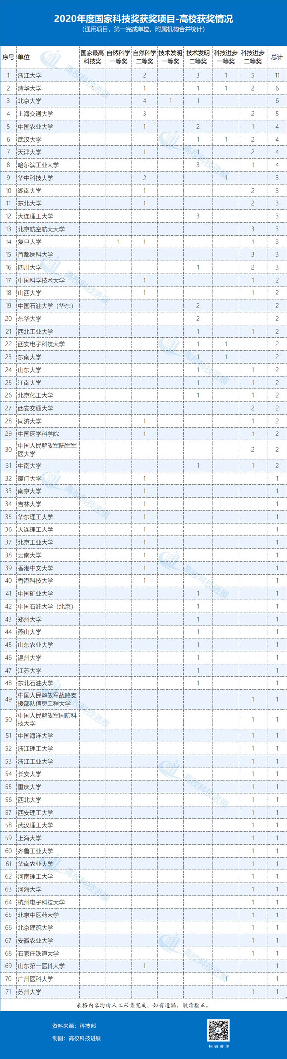 在2020年度国家科技奖通用项目中,共有71所高校以第一完成单位完成的项目获奖。