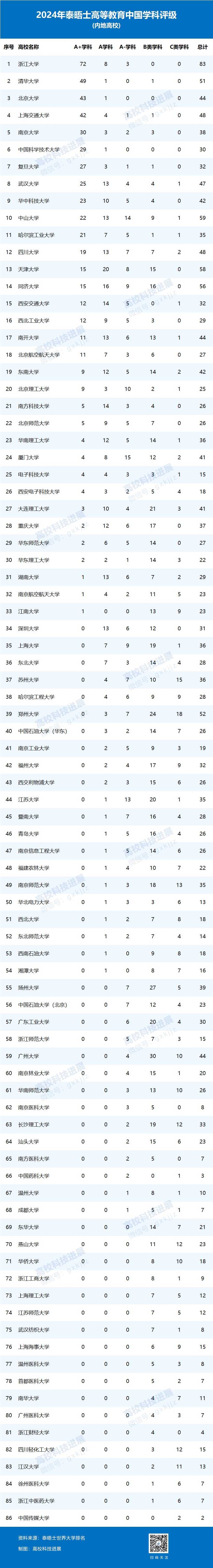 共有86所中国内地高校获得评级。中国内地的高校总共获得了534个A+评级,其中33所中国内地高校在至少一门学科中获得了A+。在不同学科中获得A+评级最多的高校分别是浙江大学(72个)、清华大学(49个)、北京大学(43个)和上海交通大学(42个)。此外,南京大学(30个)、中国科学技术大学(29个)、复旦大学(27个)、武汉大学(25个)、华中科技大学(23个)、中山大学(22个)、哈尔滨工业大学(21个)的A+学科均达20个以上。