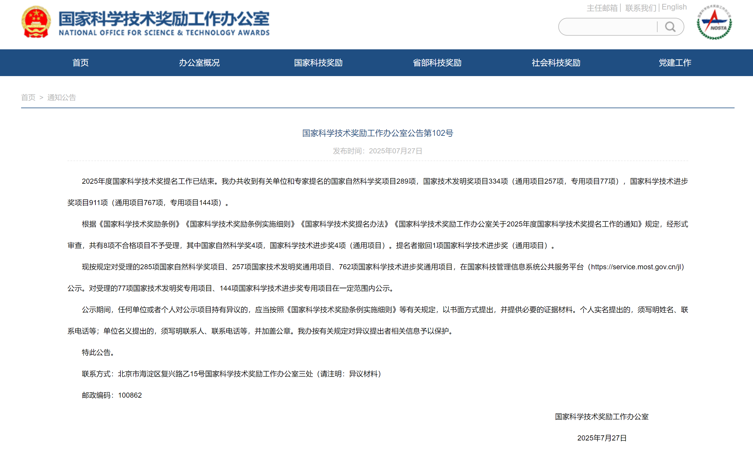 7月27日,国家科学技术奖励工作办公室公告第102号发布。根据公告,国家奖励办共收到有关单位和专家提名的国家自然科学奖项目289项,国家技术发明奖项目334项(通用项目257项,专用项目77项),国家科学技术进步奖项目911项(通用项目767项,专用项目144项)。经形式审查,共有8项不合格项目不予受理,其中国家自然科学奖4项,国家科学技术进步奖4项(通用项目)。提名者撤回1项国家科学技术进步奖(通用项目)。