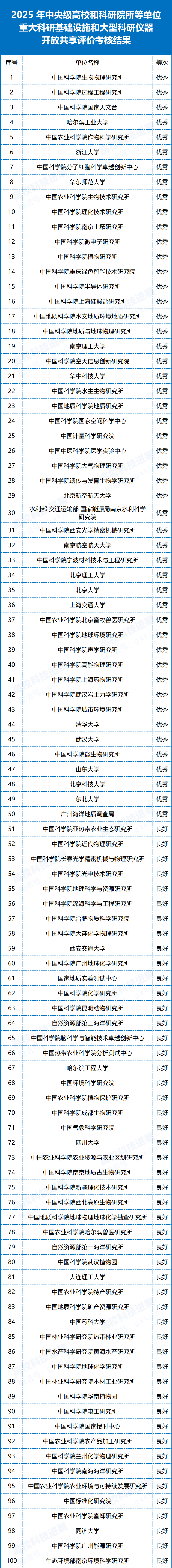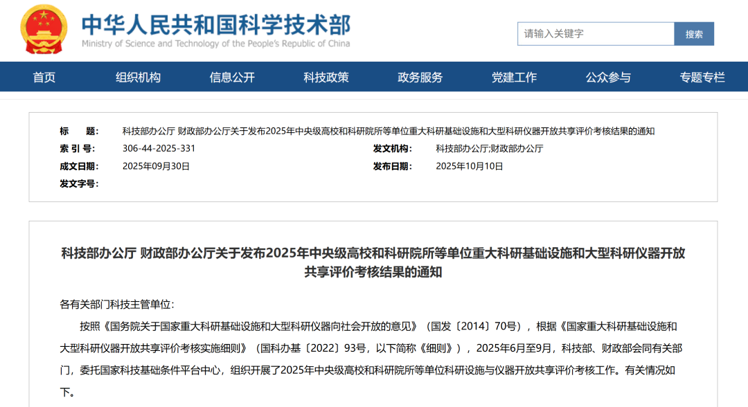 10月10日,科技部办公厅、财政部办公厅联合发布《关于2025年中央级高校和科研院所等单位重大科研基础设施和大型科研仪器开放共享评价考核结果的通知》。