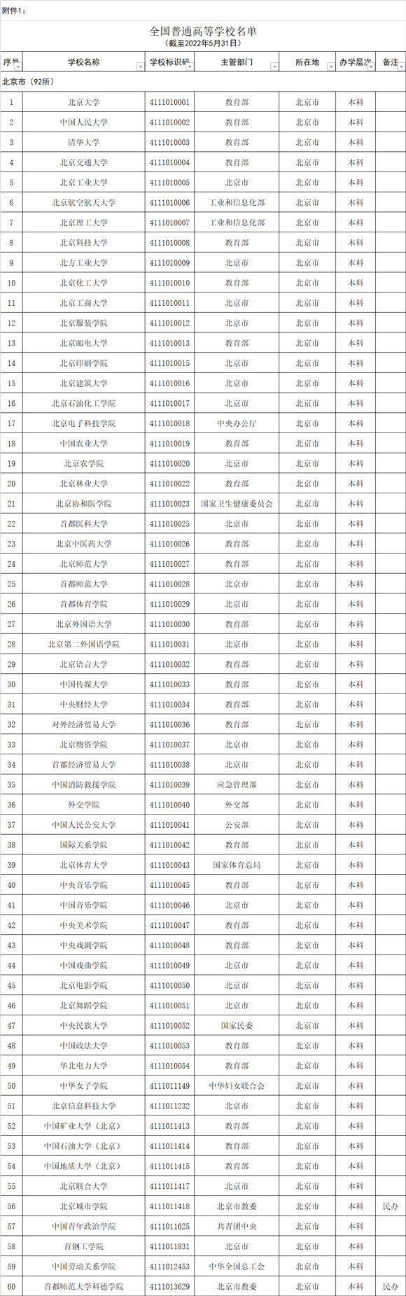 截至2022年5月31日,全国高等学校共计3013所,其中:普通高等学校2759所,含本科院校1270所、高职(专科)院校1489所;成人高等学校254所。本名单未包含港澳台地区高等学校。