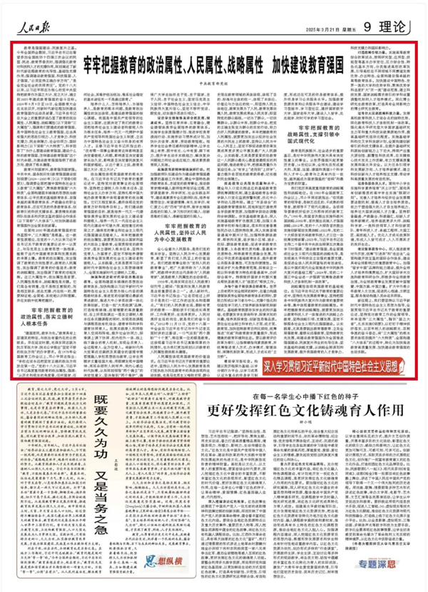 3月21日,中共教育部党组在《人民日报》刊发文章《牢牢把握教育的政治属性、人民属性、战略属性 加快建设教育强国》。