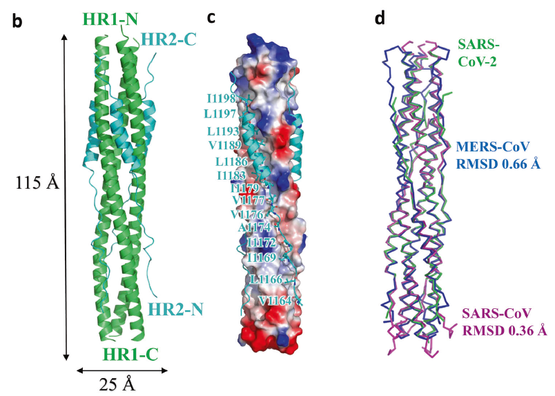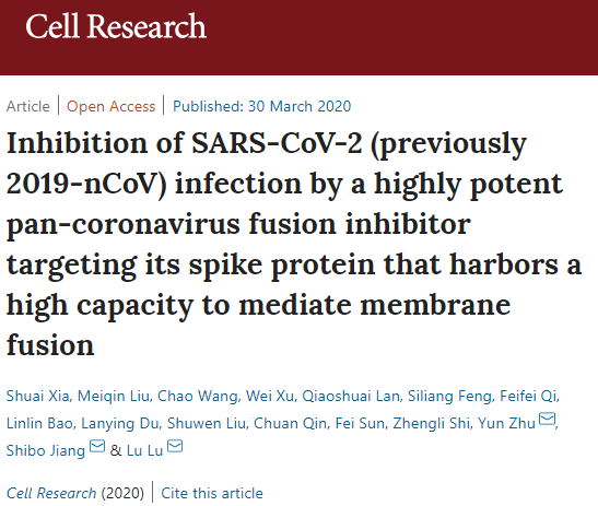 2020年3月30日,复旦大学陆路,姜世勃及中科院生物物理所Zhu Yun共同通讯在Cell Research 在线发表题为“Inhibition of SARS-CoV-2 (previously 2019-nCoV) infection by a highly potent pan-coronavirus fusion inhibitor targeting its spike protein that harbors a high capacity to mediate membrane fusion”的研究论文,该研究发现SARS-CoV-2与SARS-CoV相比具有更好的质膜融合能力。该研究解决了SARS-CoV-2 S蛋白S2亚基中HR1和HR2域的六螺旋束(6-HB)核心的X射线晶体结构,揭示了HR1域中的几个突变氨基酸残基可能是与与HR2域的增强相互作用相关。