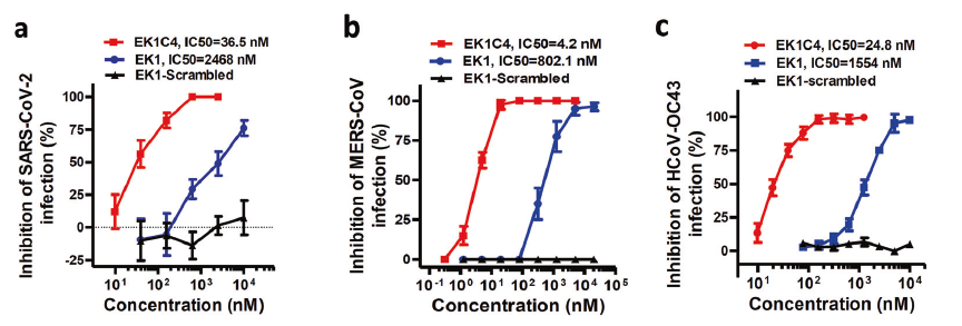 在之前的研究中,研究人员设计了针对HCoV S蛋白HR1结构域的泛冠状病毒融合抑制剂EK1,事实证明它可以有效抑制5种HCoV的感染,包括SARS-CoV和MERS-CoV,以及3种SARS-相关CoV(SARSr-CoV)。通过在冠状病毒攻击前或攻击后鼻内应用该肽,可以保护所治疗的小鼠免受HCoV-OC43或MERS-CoV感染,表明该肽具有预防SARS-CoV-2感染的预防和治疗潜力。