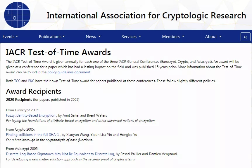 “最具时间价值奖”是国际密码协会(IACR)自2019年起设立的,该奖项每年会从15年前的三大密码学会会议欧密会(Eurocrypt)、美密会(Crypto)和亚密会(Asiacrypt)中各选出一篇论文,以表彰他们对密码学领域产生的持久影响和重要贡献。