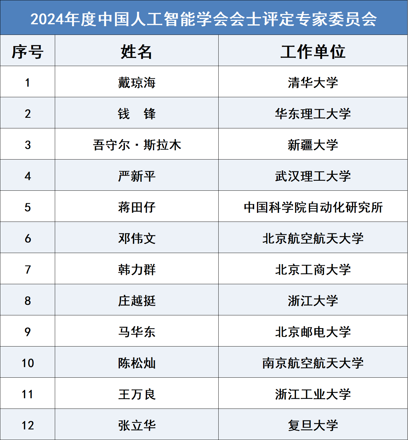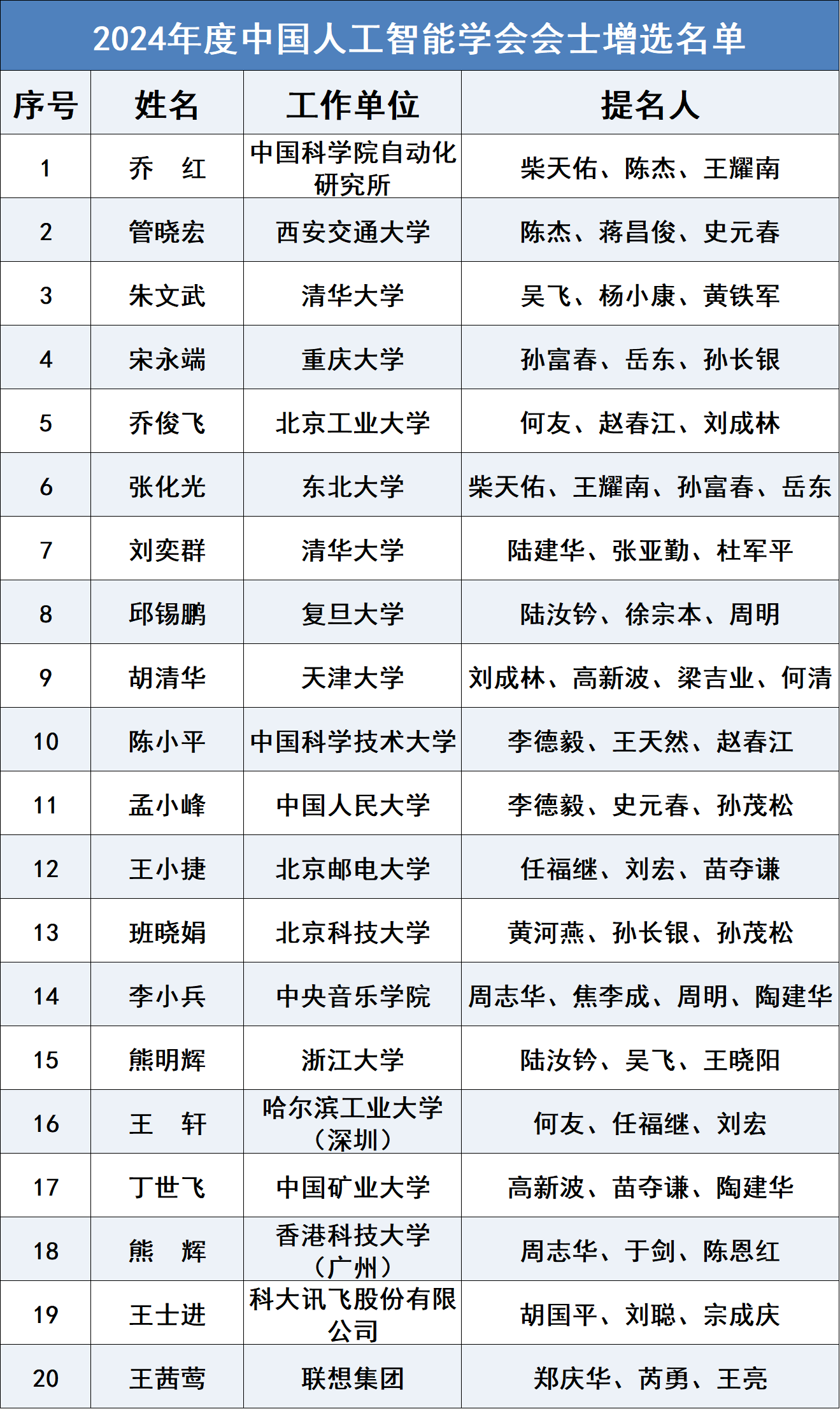 根据《中国人工智能学会章程》《中国人工智能学会会士评定工作办法》,学会于2024年2月启动中国人工智能学会会士候选人提名工作。经学会会士提名、会士评定工作委员会办公室审查、会士评定专家委员会审议投票等程序,评选出乔红、管晓宏等20位会士人选。现将名单予以公示,公示期为5个工作日(自2024年11月16日至11月22日)。