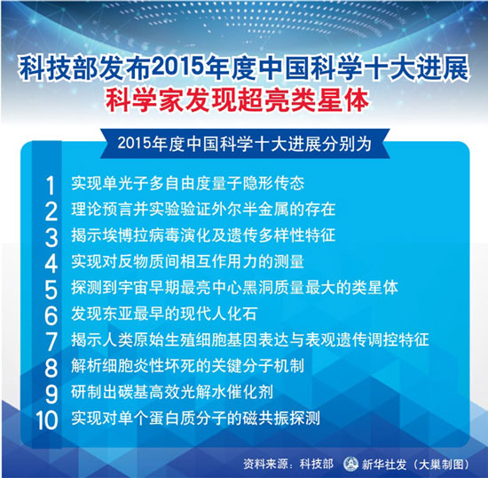 科技部2月25日在京公布2015年度中国科学十大进展,实现单光子多自由度量子隐形传态、探测到宇宙早期最亮中心黑洞质量最大的类星体和解析细胞炎性坏死的关键分子机制等研究入选。