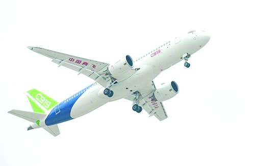 我国首款国际主流水准的国产大型客机C919于2017年5月5日14时许在上海浦东国际机场首飞。C919的全称是“COMAC919”,COMAC是C919的主制造商中国商飞公司的英文名称简写,“C”既是“COMAC”的第一个字母,也是中国的英文名称“CHINA”的第一个字母,体现了大型客机是国家的意志、人民的期望。第一个9寓意“天长地久”,19寓意C919大型客机最大载客量190人。C919拥有完全自主知识产权,是建设创新型国家的标志性工程,凝聚了国内最优秀的设计人才和工程人才,针对先进的气动布局、结构材料和机载系统,研制人员共规划了102项关键技术攻关,包括飞机发动机一体化设计、电传飞控系统控制律设计、主动控制技术等。