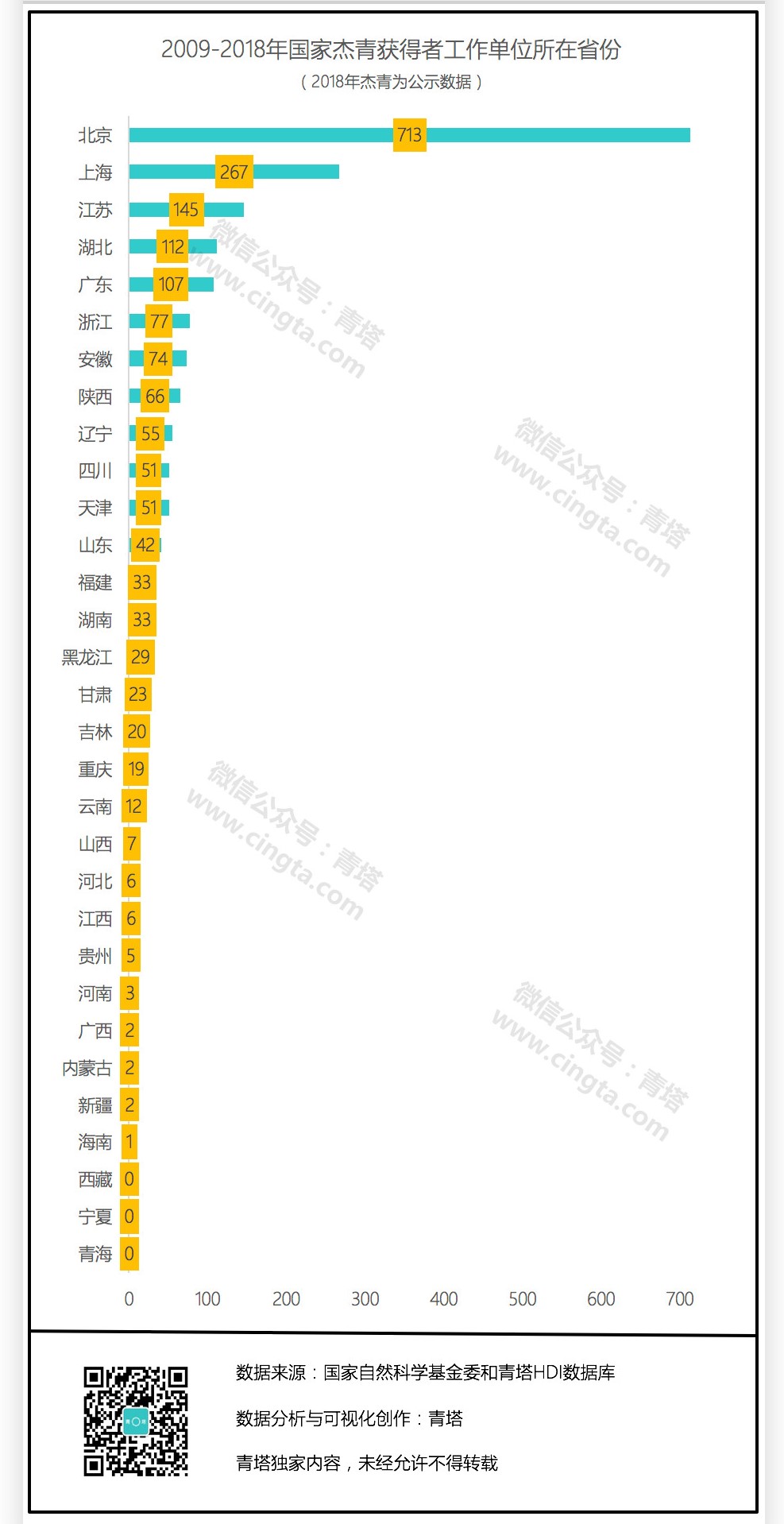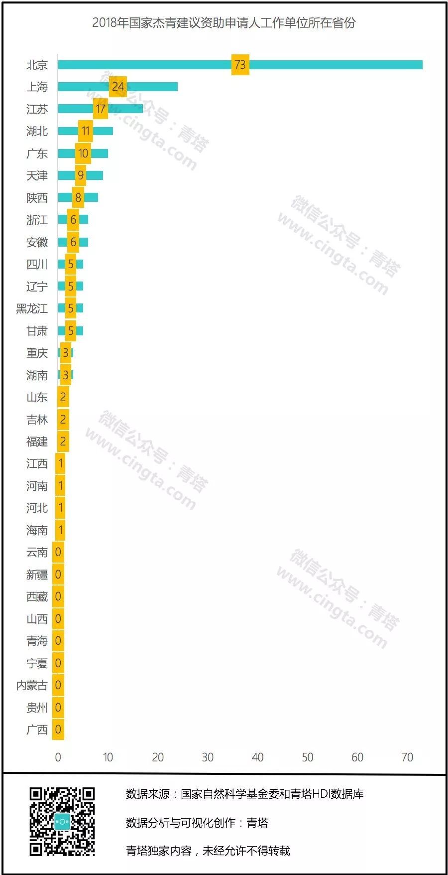 今天青塔对2018年国家杰青候选人以及2009-2018年国家杰青获得者工作单位的省份进行统计,一起来看看全国各省高层次人才差距有多大。