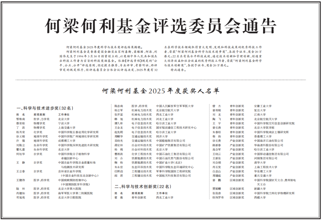 何梁何利基金是香港爱国金融实业家何善衡、梁銶琚、何添、利国伟先生于1994年3月30日捐资创立的、以奖励中华人民共和国杰出科技工作者为宗旨的科技奖励基金。依据《评选章程》规定的"公平、公正、公开"评选原则,经过提名推荐、专业评审、考察听证、终评审定的既定程序,经评选委员会全体会议评选决定,2025年度有32名在科学技术领域取得重大发明、发现和科技成果的优秀科技工作者,荣获"何梁何利基金科学与技术进步奖",各授予证书、奖金20万港元;22名具有高水平科技成就,通过技术创新和管理创新,创造重大经济效益和社会效益的优秀科技工作者,荣获"何梁何利基金科学与技术创新奖",各授予证书、奖金20万港元。