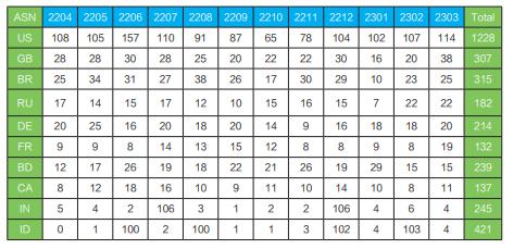 表3 近12个月ASN号码新增数最多的国家/地区(单位:个)