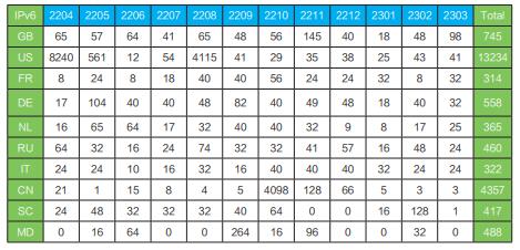 3月全球IPv6地址申请(/32以上)总计196个,其中欧洲74个,亚太56个,拉美42个,北美18个,非洲6个,分别来自58个国家/地区。申请个数最多的是巴西,24个;其次是美国,20个。3月没有较大的地址申请。3月全球IPv6地址分配数量为686*/32,其中获得地址最多的是英国,98*/32;其次是美国,41*/32。在过去的12个月,全球IPv6地址分配数量为26547*/32,其中获得地址最多的是美国,13234*/32;其次是中国,4357*/32。