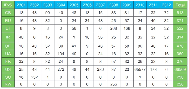 12月全球IPv6地址申请(/32以上)总计164个,其中欧洲74个,亚太40个,拉美39个,北美8个,非洲3个,分别来自53个国家/地区。申请个数最多的是巴西,24个;其次是摩尔多瓦,17个。12月没有较大的地址申请。12月全球IPv6地址分配数量为648*/32,其中获得地址最多的是摩尔多瓦,136*/32;其次是英国,72*/32。在过去的12个月,全球IPv6地址分配数量为74310*/32,其中获得地址最多的是美国,66569*/32;其次是立陶宛,522*/32。