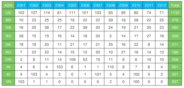 表3 近12个月ASN号码新增数最多的国家/地区(单位:个)