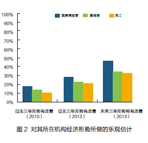 从图2可以看出,2013年的参与者百分比表明其所在机构的状况在过去三年中得到了改善,高于2010年。此外,2013年的参与者对未来三年的形势表现得更为乐观。在三组受访者中,CIO表现得最为乐观。不过,尽管乐观情绪呈上升趋势,但大多数人仍不认为其所在机构的经济形势得到了改善或将有所改善。超过一半的CIO不相信其所在机构的经济状况在未来三年将有所改善。