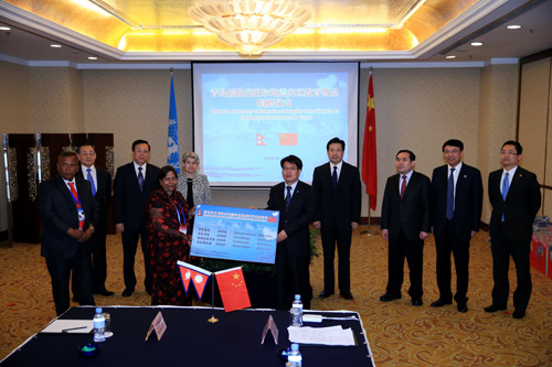 联合国教科文组织总干事伊琳娜·博科娃女士,尼泊尔教育部部长齐特拉·亚达夫,联合国教科文组织大会主席、中国教育部副部长郝平出席捐赠仪式。