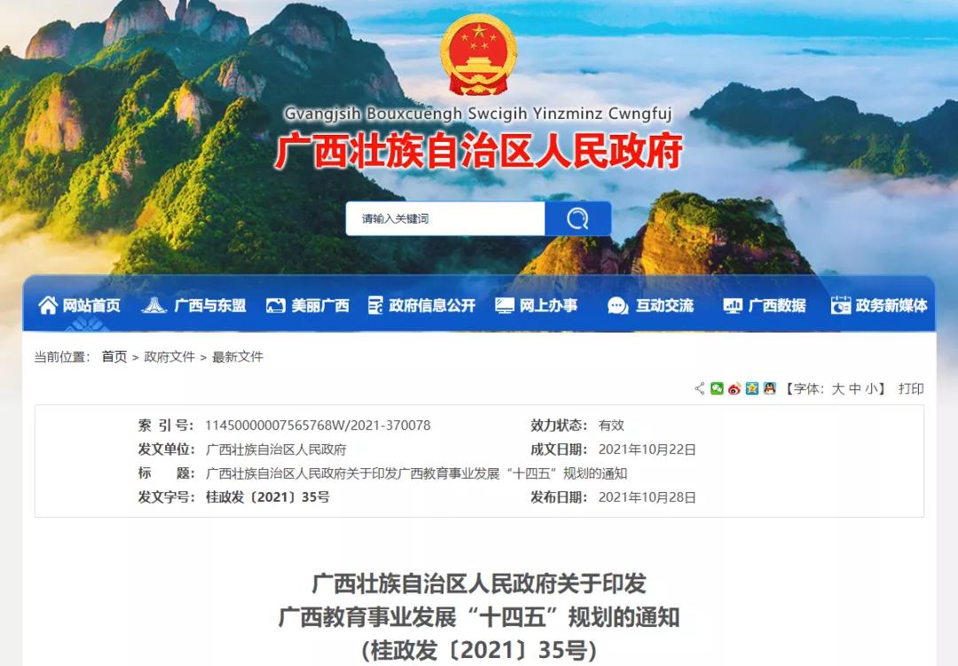 日前,为促进广西教育高质量发展,推动科教振兴,加快推进教育现代化,广西壮族自治区人民政府印发《广西教育事业发展“十四五”规划》。