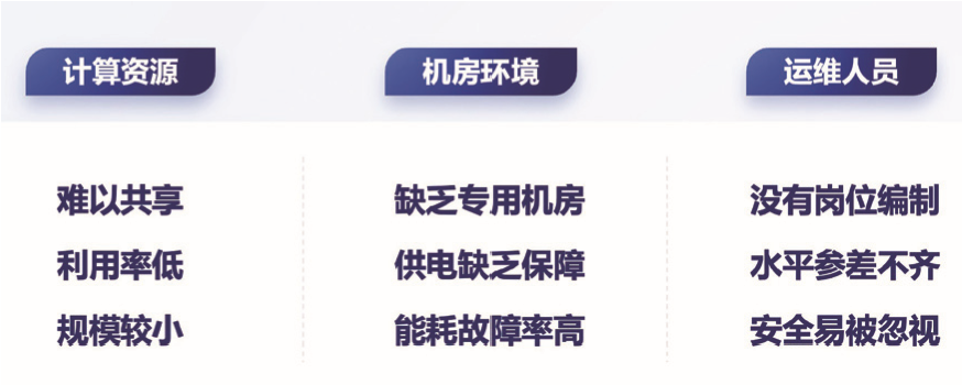 例如,学校建设了校级算力平台之后,是否还应该允许院系建自己的平台?实际上,院系分散建设有很多局限性,其计算资源难以共享,利用率低;运维人员往往没有岗位编制,水平也参差不齐,如图1所示。在学校已经建设了校级算力平台的情况下,往往会造成很多资源浪费。