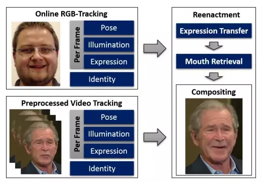 CVPR全称为计算机视觉和模式识别大会 (Computer Vision and Pattern Recognition),是一年一度的视觉领域最高学术会议。因此,早在该研究成果公布伊始,国内媒体就对其进行了报道:“这个技术的原理是通过一种密集光度一致性办法(Dense Photometric Consistency measure),达到跟踪源和目标视频中脸部表情的实时转换,由于间隔的时间很短,使得‘复制’面部表情成为可能,但现在还没办法实现声音也一样模仿出来。”