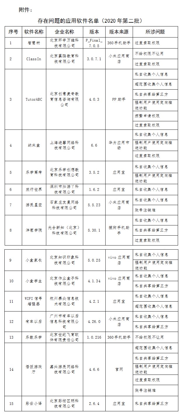 记者7月3日从工业和信息化部官网获悉,工信部信息通信管理局公布《关于侵害用户权益行为的APP通报(2020年第二批)》显示,依据《网络安全法》《电信条例》《电信和互联网用户个人信息保护规定》等法律法规,工信部近期组织第三方检测机构对手机应用软件进行检查,对发现存在问题的企业进行督促整改。截至目前尚有15款APP未完成整改,其中“智慧树”“乐学高考”“旅行世界”等APP在列。