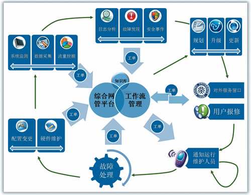 面对这个问题,如果单纯从软件结合的角度考虑比较难于解决。软件是应需而生的,如果把网管软件的目标定位在提高网络服务的可用性、促进网络管理的效率、减轻一线网管人员工作负担的角度上,不同的网管软件就有了结合的基础。传统的网管系统通常是以设备为中心,围绕设备的管理维护进行工作,以设备正常工作为目标。这个想法本身并没有问题。不过,实际的网络维护和网络管理是由网络管理人员参与的工作,网络所提供的服务最终也是面向用户的。人是这项工作的主体。应该让网络管理这个过程也变得可管理。可以借用“工作流”的思路来帮助完成这种转变:有关网络管理的事件处理按照一定的流程进行,把对流程的处理也纳入网络管理系统的一部分。