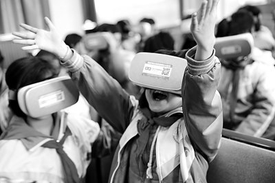 湖南省湘西土家族苗族自治州吉首大学师范学院附属小学的同学们在VR教室体验科技知识。彭彪摄/光明图片