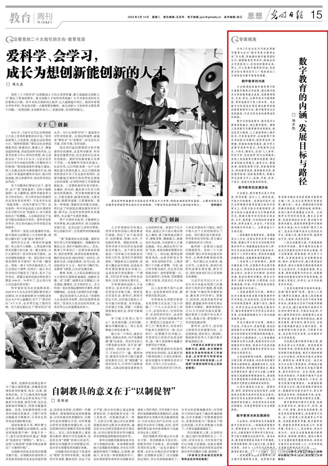 日前,教育部教育信息化战略研究基地(华中)主任、武汉理工大学校长杨宗凯在《光明日报》“专家视角”专栏撰文《数字教育的内涵、发展目标与路径》,阐述对数字教育的理解。以下为文章全文,供大家学习收藏!