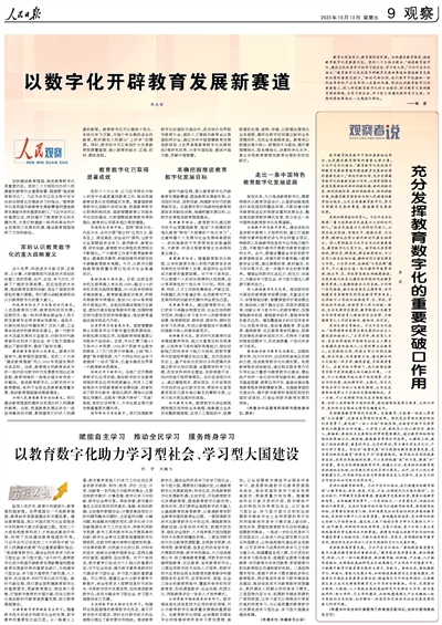 2023年10月13日,人民日报在第9版观察,整版阐述推进教育数字化。刊发了中国教育科学研究院党委书记、院长李永智,中共北京市委教育工作委员会副书记、北京市教育委员会主任李奕,以及长春师范大学佟宇、刘鹏飞的专题文章,一起来看佟宇、刘鹏飞的《以教育数字化助力学习型社会、学习型大国建设》详情——