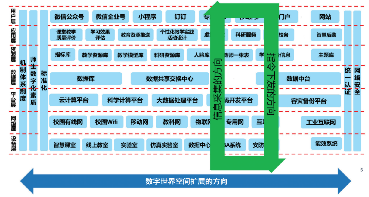 纵轴是技术层次维度,从下至上可以分为设备层、网络层、平台层、数据层,资源层、应用层、用户层;横轴是数字空间维度,是同一技术层面上沿数字空间分布不同的系统,例如网络层面,有校园有线网、校园Wifi、物联网、专用网、移动网、教科网、互联网等。从纵轴方向看,信息采集的方向是从下至上,而指令下发的方向是从上至下。一个好的生态是闭环系统,因此,上下流动的数据应该在数字空间连接成一个环,并且,这个环应该在数字空间维度展开,因为,如果系统在数字空间维度上不展开,数据就会在小系统内部流动形成“数据烟囱”,这是需要避免的现象。因此,我们也需要数据沿横轴方向流动,并沿横轴打通数据空间的各个模块。