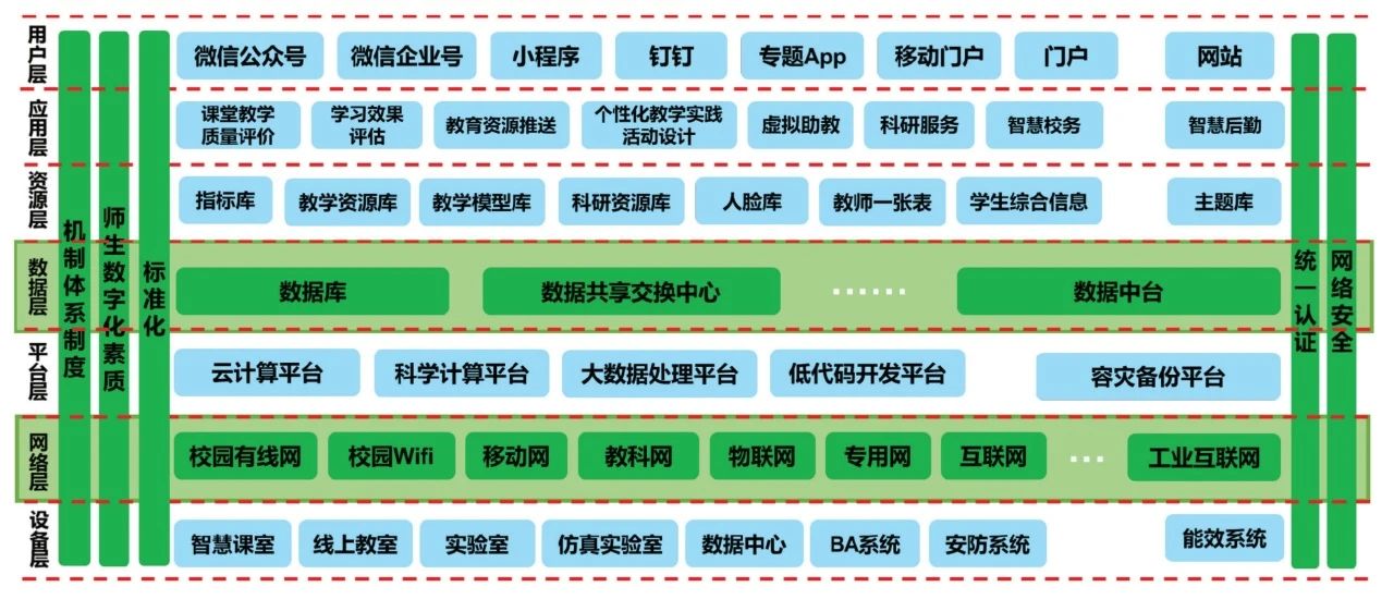 其中,“两梁”是数字化系统架构图中的网络和数据两个技术层面,“五柱”是机制体系制度、师生数字化素质、标准化、统一认证和网络安全五个贯穿各个技术层面的工作。