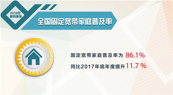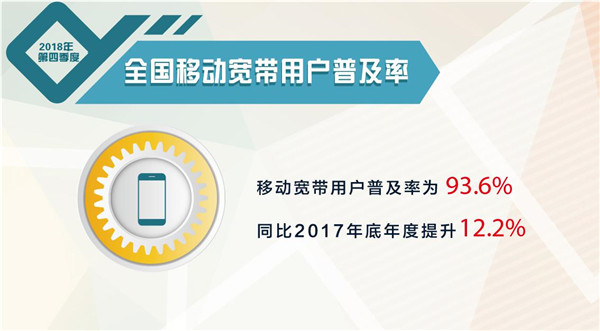 近日,我国宽带发展联盟发布了第十一期《中国宽带普及状况报告》(2018年第四季度),报告显示,截至2018年第四季度,我国固定宽带家庭用户数累计达到39376.5万户,固定宽带家庭普及率达到86.1%,同比2017年底年度提升11.7%;移动宽带(3G和4G)用户数累计达到130564.7万户(不包含移动通信转售用户),移动宽带用户普及率达到93.6%,同比2017年底年度提升12.2%。