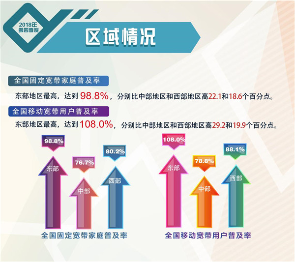 从区域宽带普及状况看,我国宽带普及水平均呈现东、西、中部由高到低排列的态势:固定宽带家庭普及率,东部地区达到98.8%,分别比中部地区和西部地区高22.1和18.6个百分点;移动宽带用户普及率,东部地区达到108.0%,分别比中部地区和西部地区高29.2和19.9个百分点。