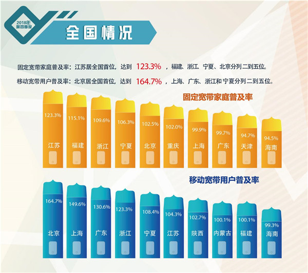 从各地的宽带普及状况看,固定宽带家庭普及率方面,江苏省最高,达到123.3%(固定宽带家庭普及率超过100%,一是存在一个家庭用户拥有多个固定住所,办理了多个固定宽带接入业务的情况;二是存在一个家庭用户办理了不同宽带接入业务服务提供商的多个固定宽带接入业务的情况),排在前五位的地区还有福建省、浙江省、宁夏回族自治区和北京市。移动宽带用户普及率方面,北京市达到164.7%,远远超过其他地区,但比上一季度有所下降,排在前五位的还有上海市、广东省、浙江省和宁夏回族自治区,排在前九位的地区均超过了100%。