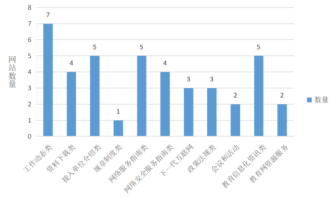 2.业务服务信息。为入网单位提供的教育科研网相关服务信息,包括工作动态、服务指南、资料下载、规章制度、政策法规、会议和活动、教育信息化领域资讯、教育网资源服务等信息。8个网站都提供了服务信息,同时在栏目类别、数量及具体内容丰富度上有所区别。