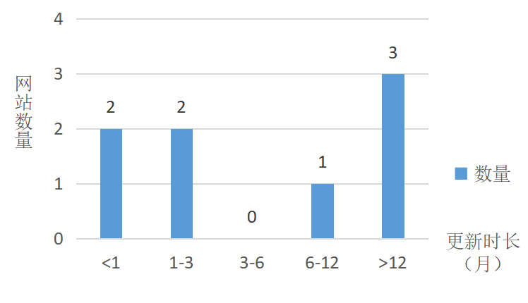 网站更新与维护是用户顺利访问网站、及时获取信息的保障。如图3所示,通过网站最新内容更新时间距离2023年6月1日的时长统计发现,更新时长在1个月以内的平台为2个,更新时长在1个月以上、3个月以内的平台有2个,更新时长为6个月以上、1年以内的平台为 1个,更新时长在1年以上及无更新维护的平台为3个。