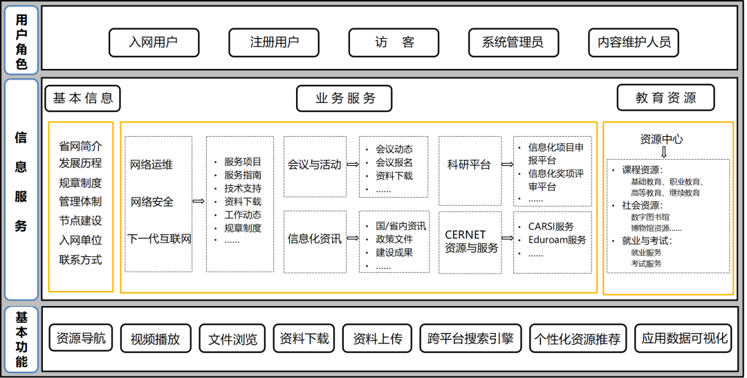 业务服务:围绕省级教育科研网核心业务,设置网络运维、网络安全、下一代互联网、会议与活动、信息化资讯、科研平台、CERNET资源与服务等板块。前3个板块可分别包括服务项目(含互联网+业务服务)、服务指南、技术支持、资料下载、工作动态、规章制度等内容。会议与活动板块包括会议动态、会议报名、资料下载等内容。信息化资讯板块则包括国内和省内教育信息化资讯、政策文件、建设成果等。科研平台主要包括各级教育主管部门面向信息化工作与从业人员的项目申报与奖项评审等平台。CERNET资源与服务指 CERNET提供的特色服务,如CARSI服务、Eduroam服务等。
